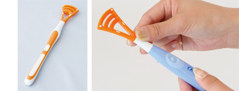 ブラシとヘラで汚れをやさしくかき出す。ブラシで舌乳頭のすき間を、ヘラで舌の表面全体の汚れをかき